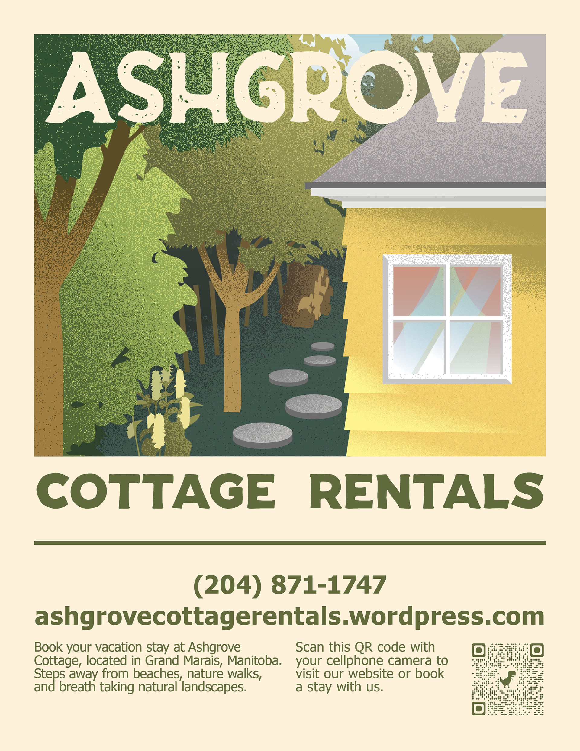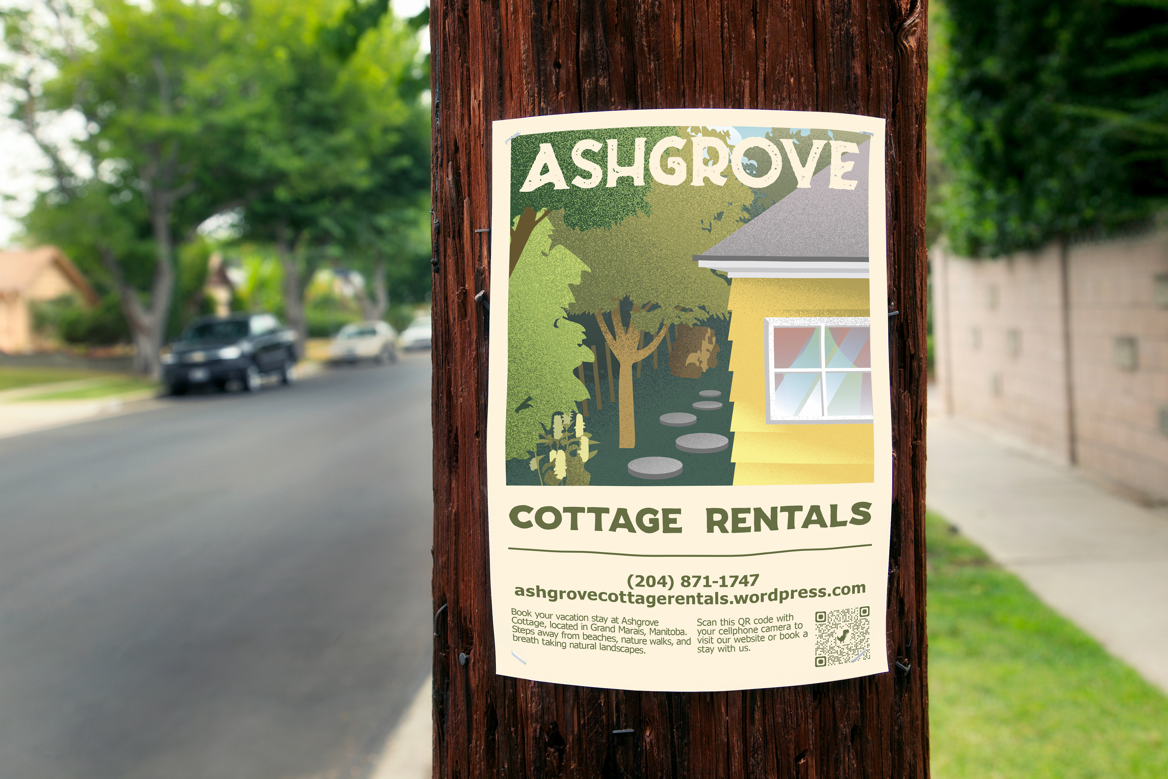 Ash Grove Cottage Rentals is an independent cottage rental business in Grand Marais Manitoba. As the graphic designer for Ash Grove Cottage Rentals, I was tasked with designing the company's brand, print ads, and website.