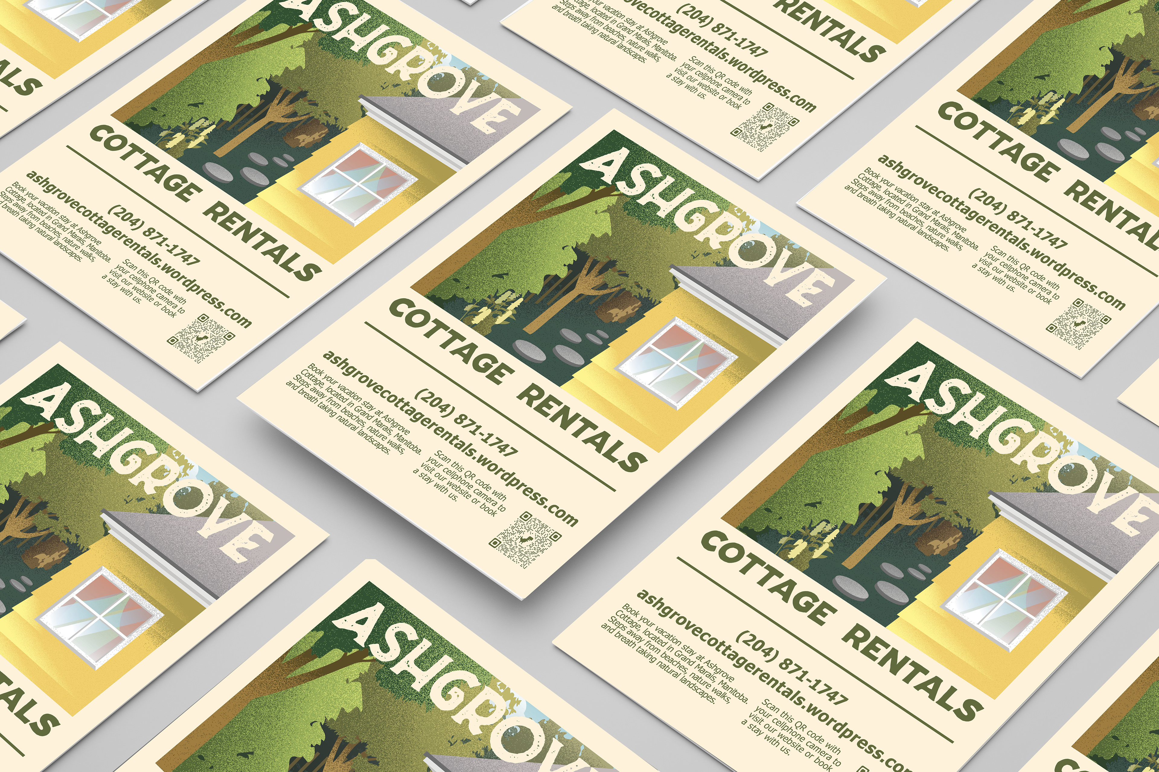 Ash Grove Cottage Rentals is an independent cottage rental business in Grand Marais Manitoba. As the graphic designer for Ash Grove Cottage Rentals, I was tasked with designing the company's brand, print ads, and website.