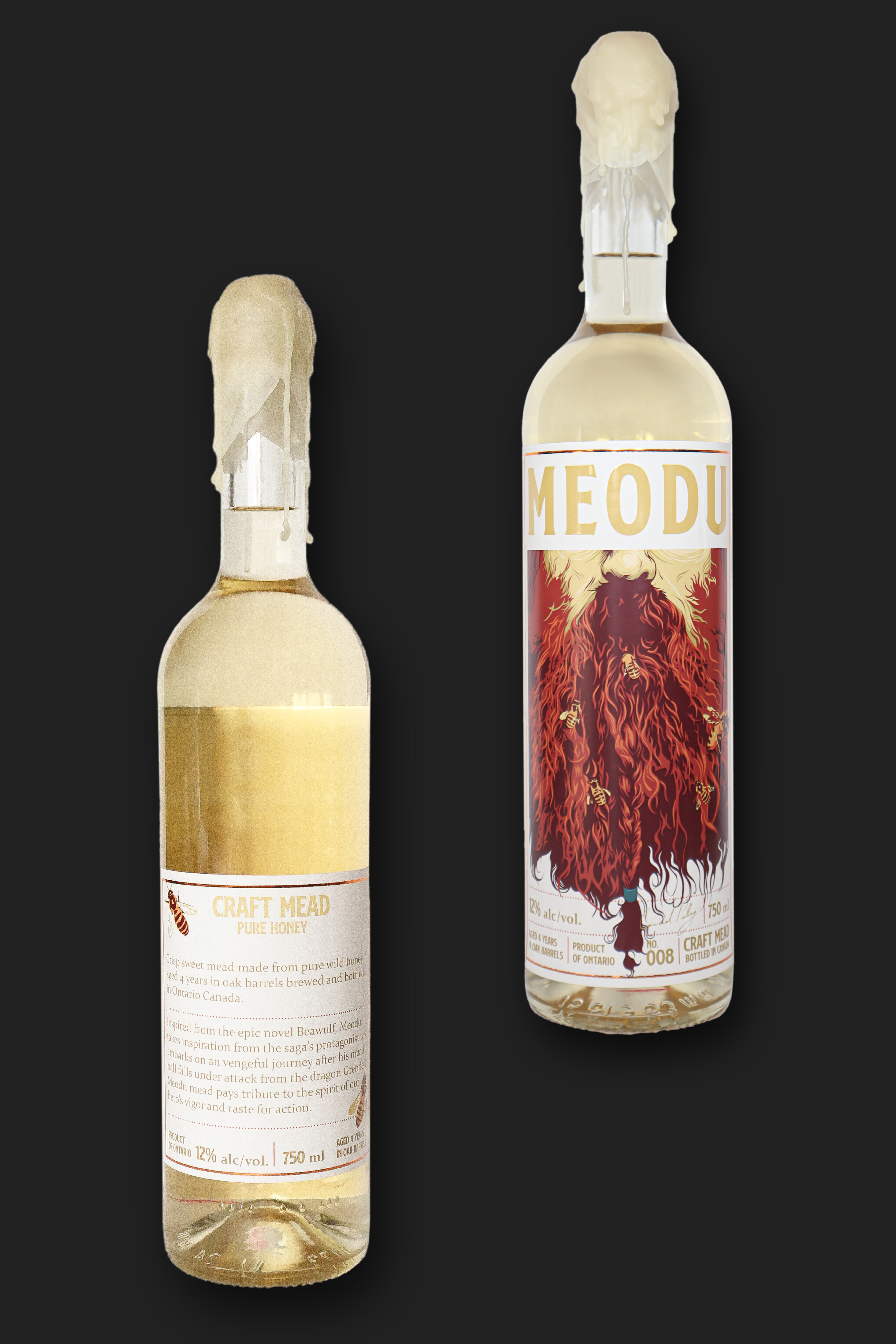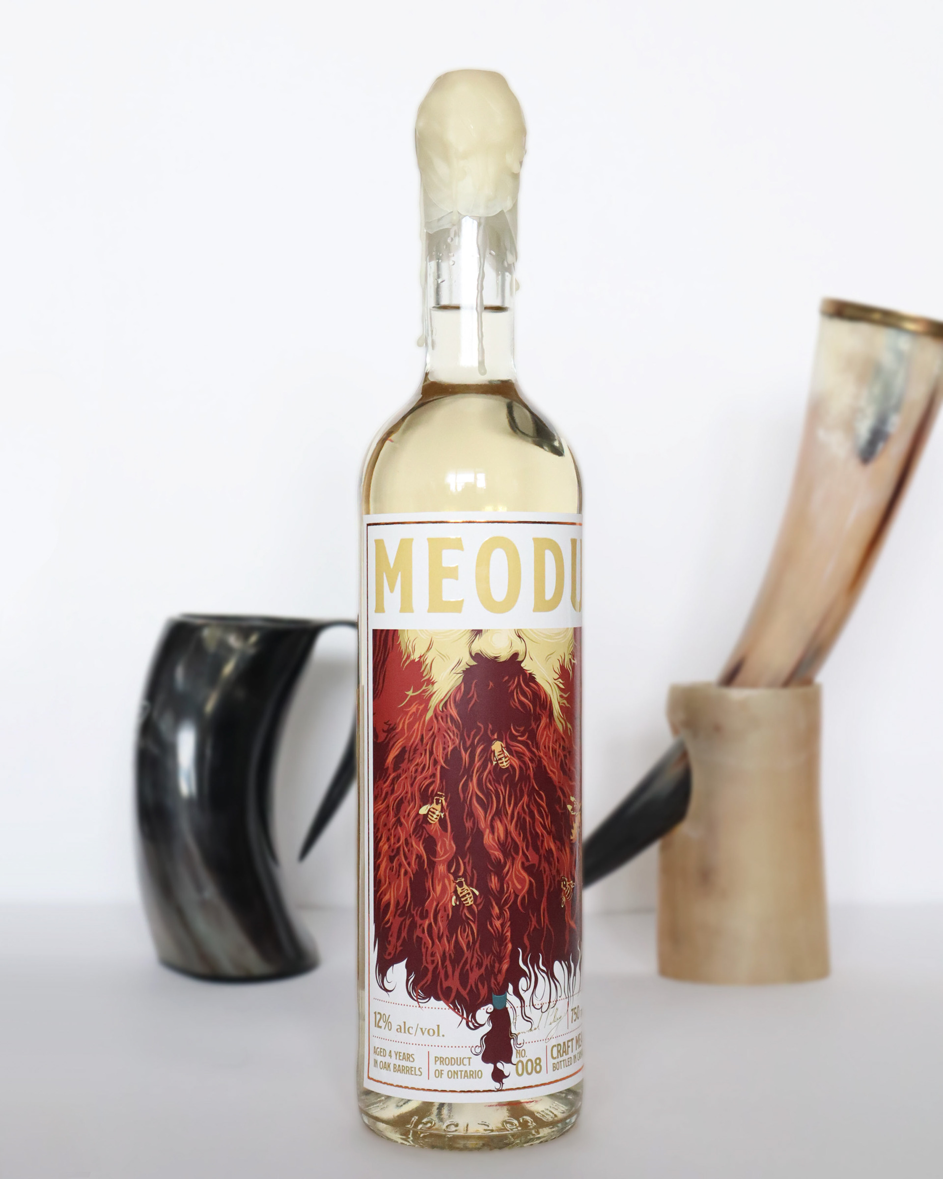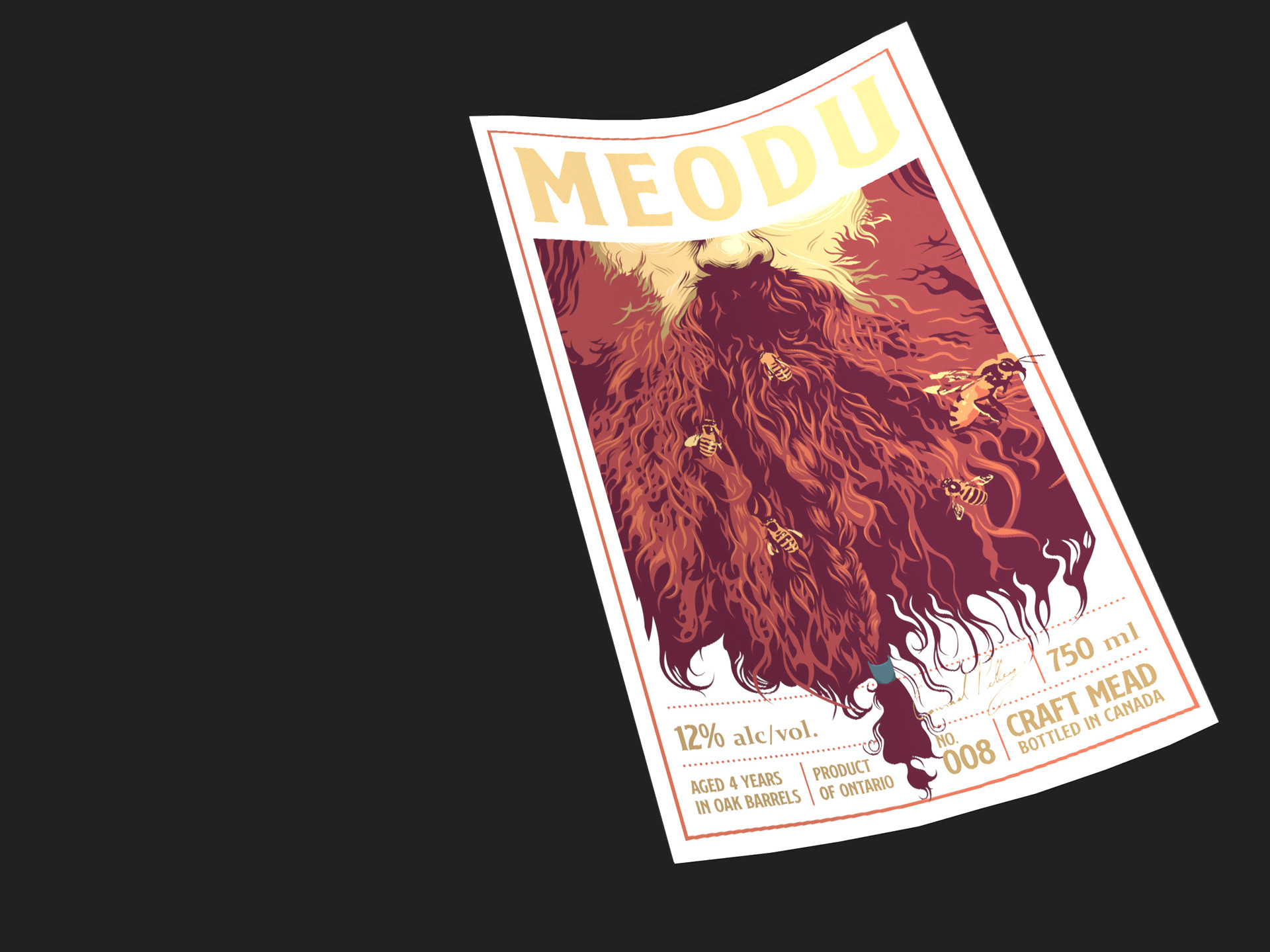 Printed as proof at last. After talking with the print company about my ideas for the production, Meodu's label ended up with a gloss finish on the logo and a metallic ink border. I also sealed the quark with real beeswax which I thought complimented the colour of the label and beverage quite nicely.
