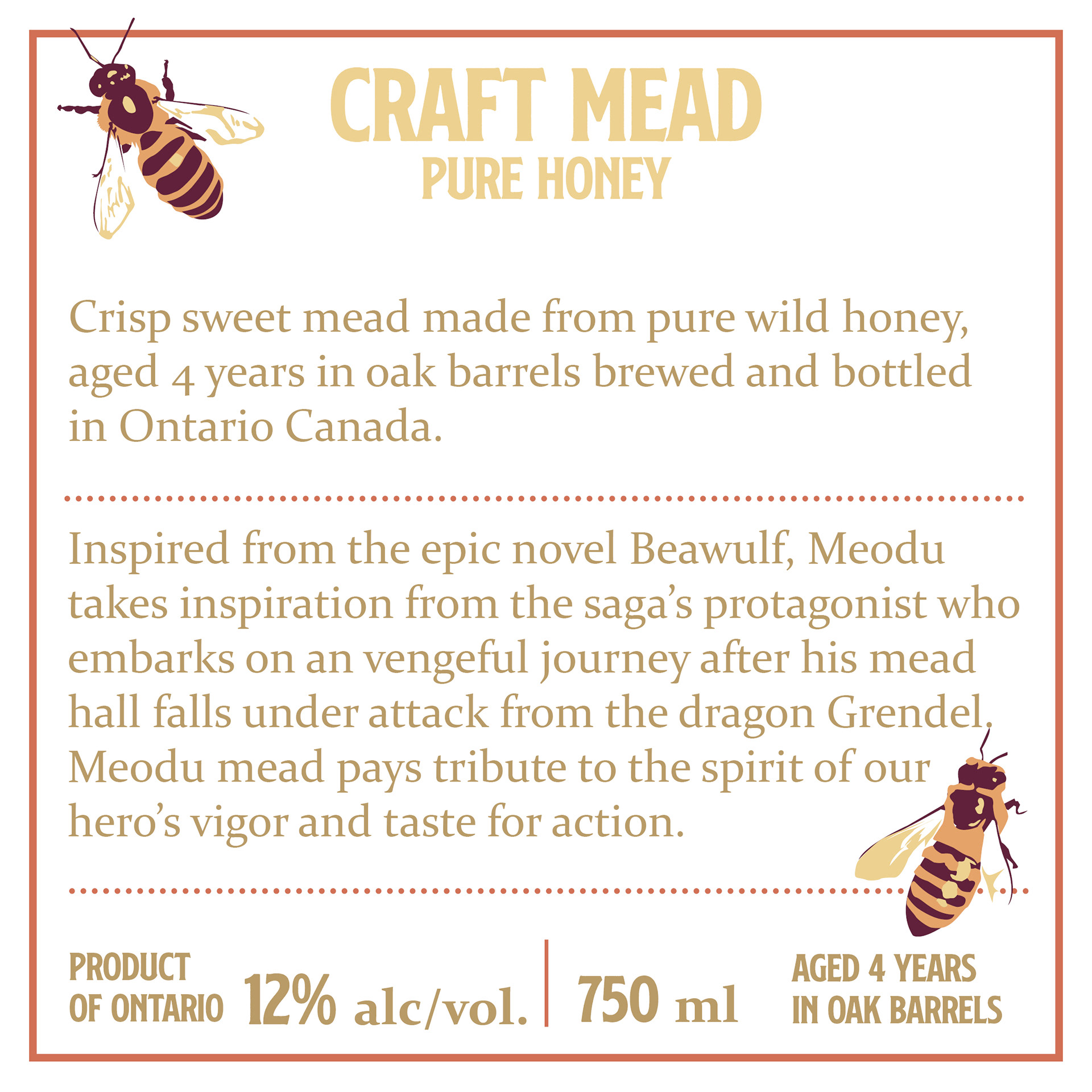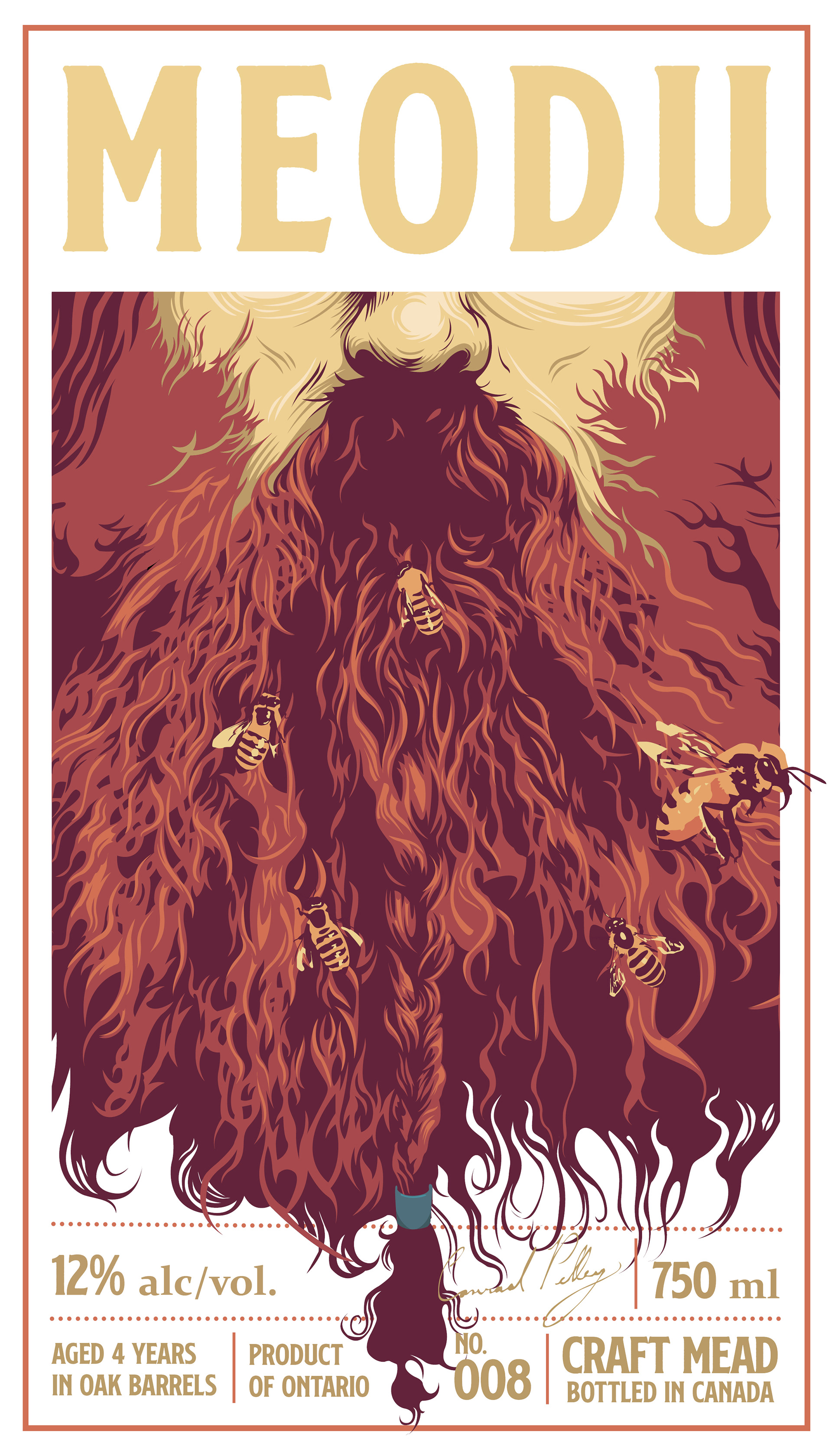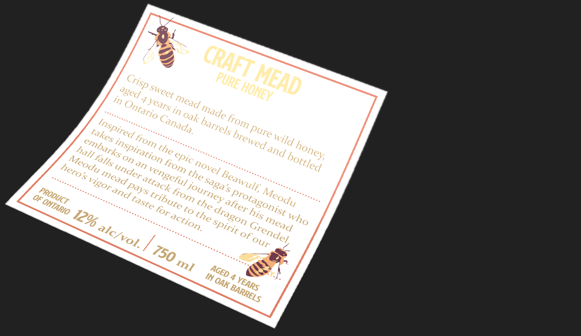 Printed as proof at last. After talking with the print company about my ideas for the production, Meodu's label ended up with a gloss finish on the logo and a metallic ink border. I also sealed the quark with real beeswax which I thought complimented the colour of the label and beverage quite nicely.
