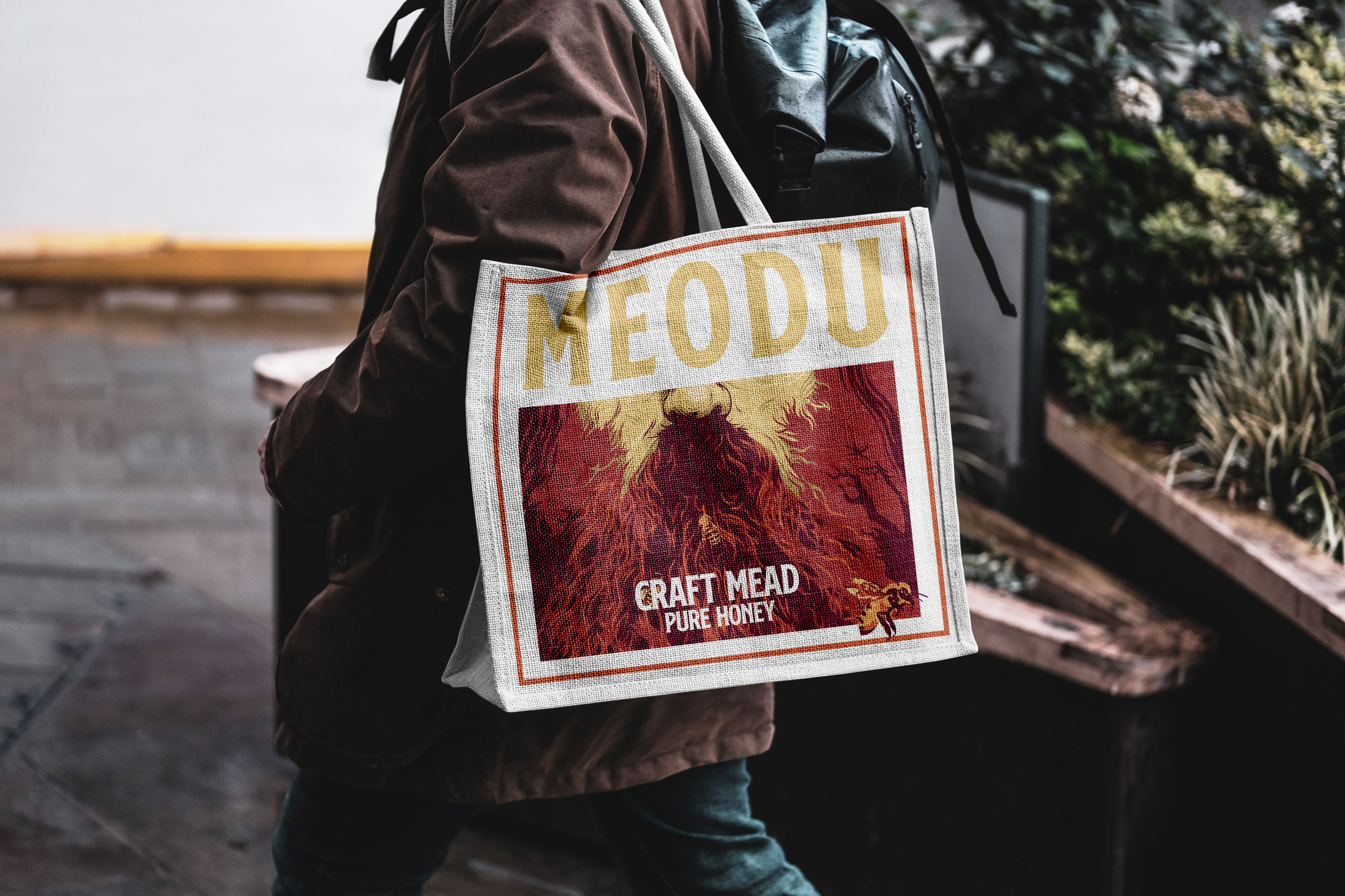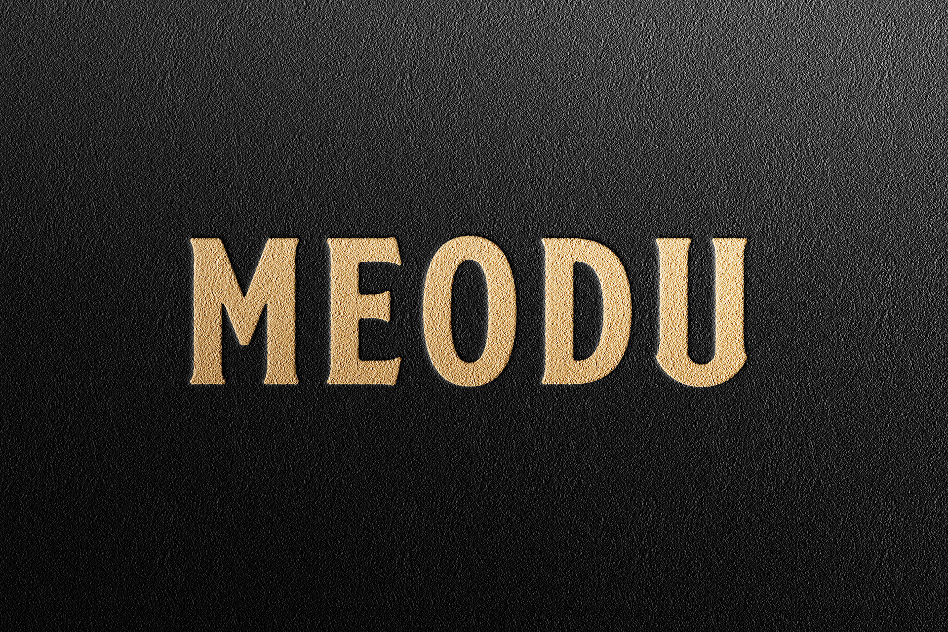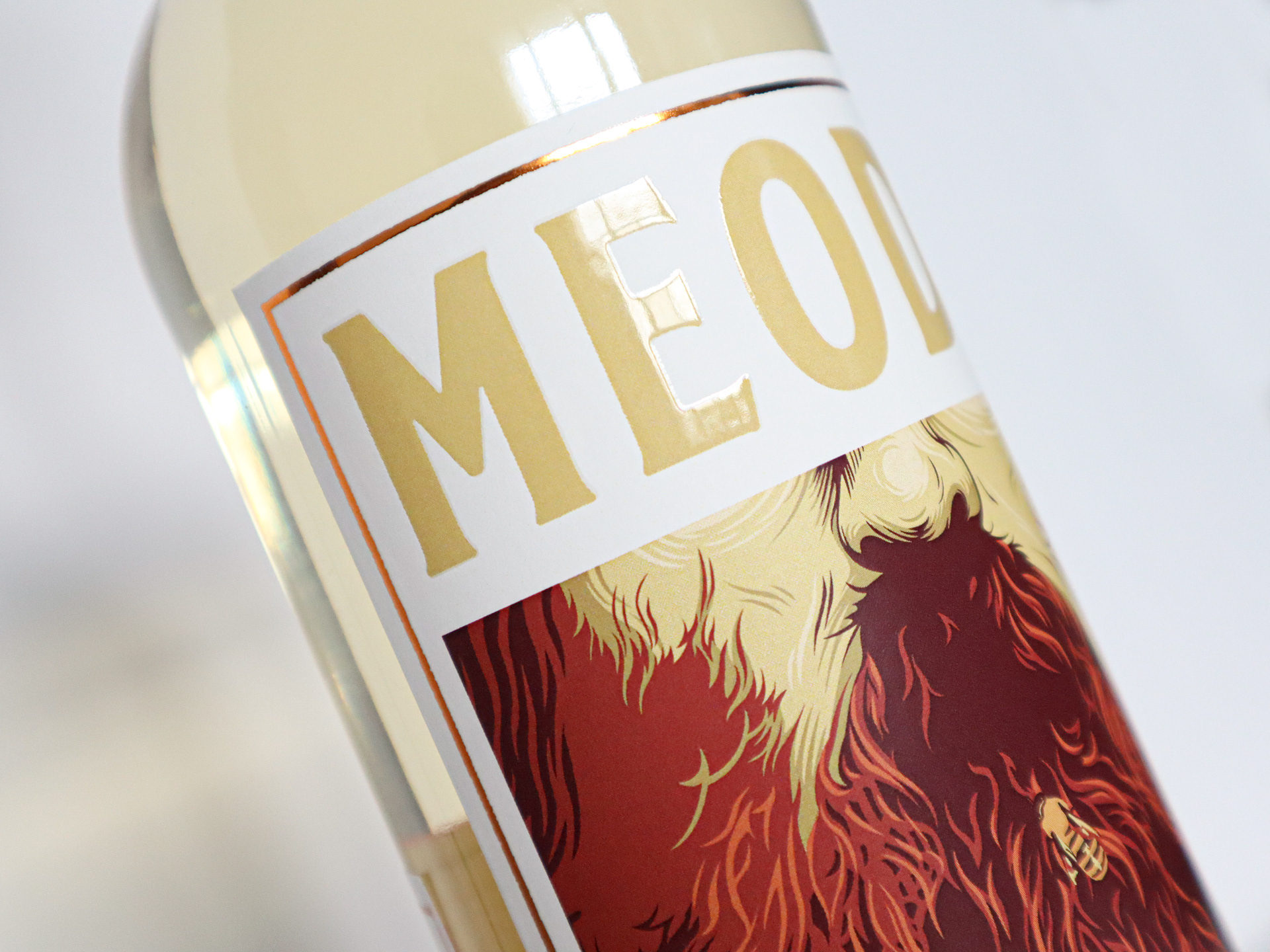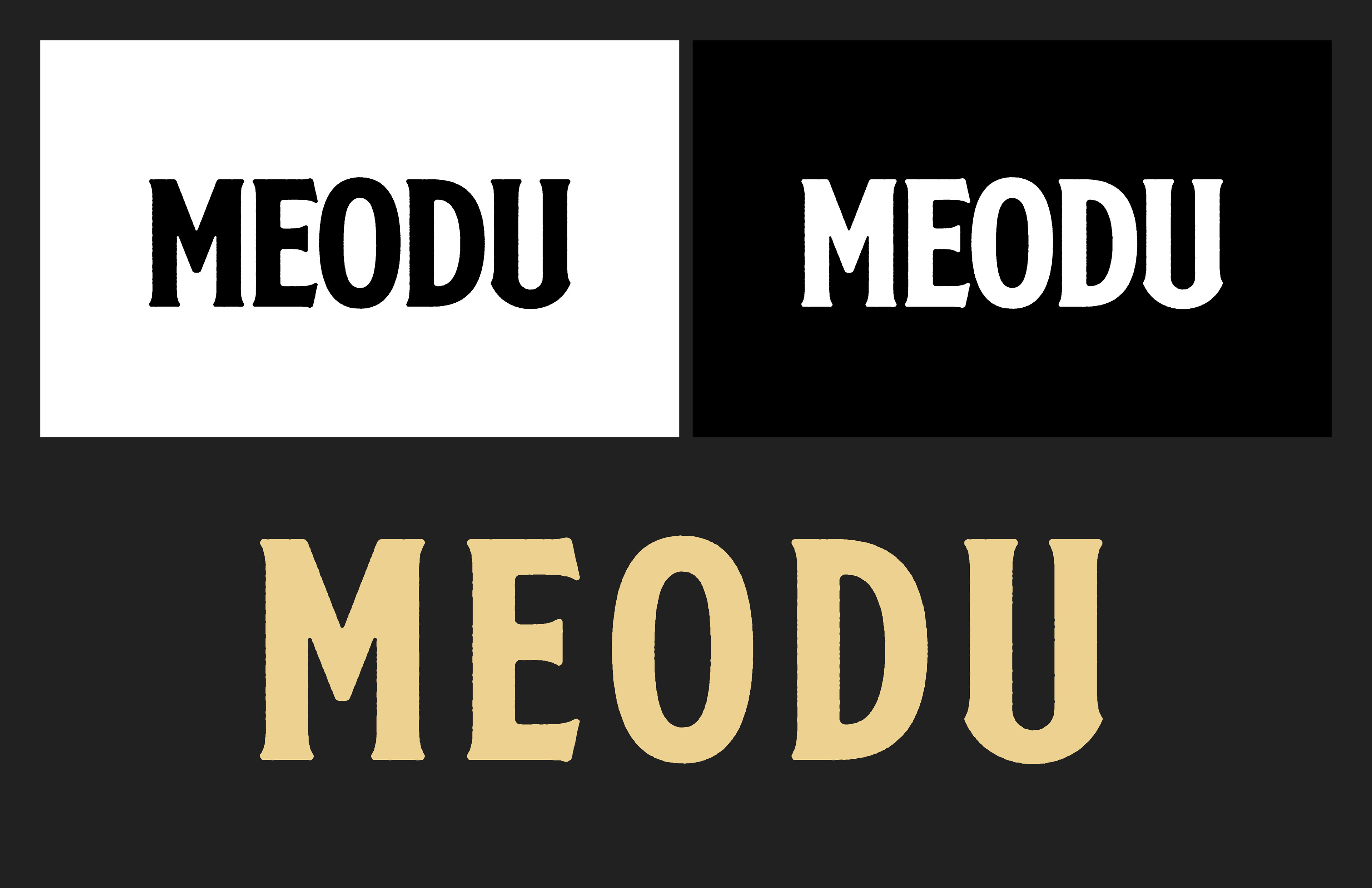 The Meodu Logo as it appears in black, white, and treated for print on the bottle label. In a honey-yellow taken from the brand colours, with the tracking for the bottle design.