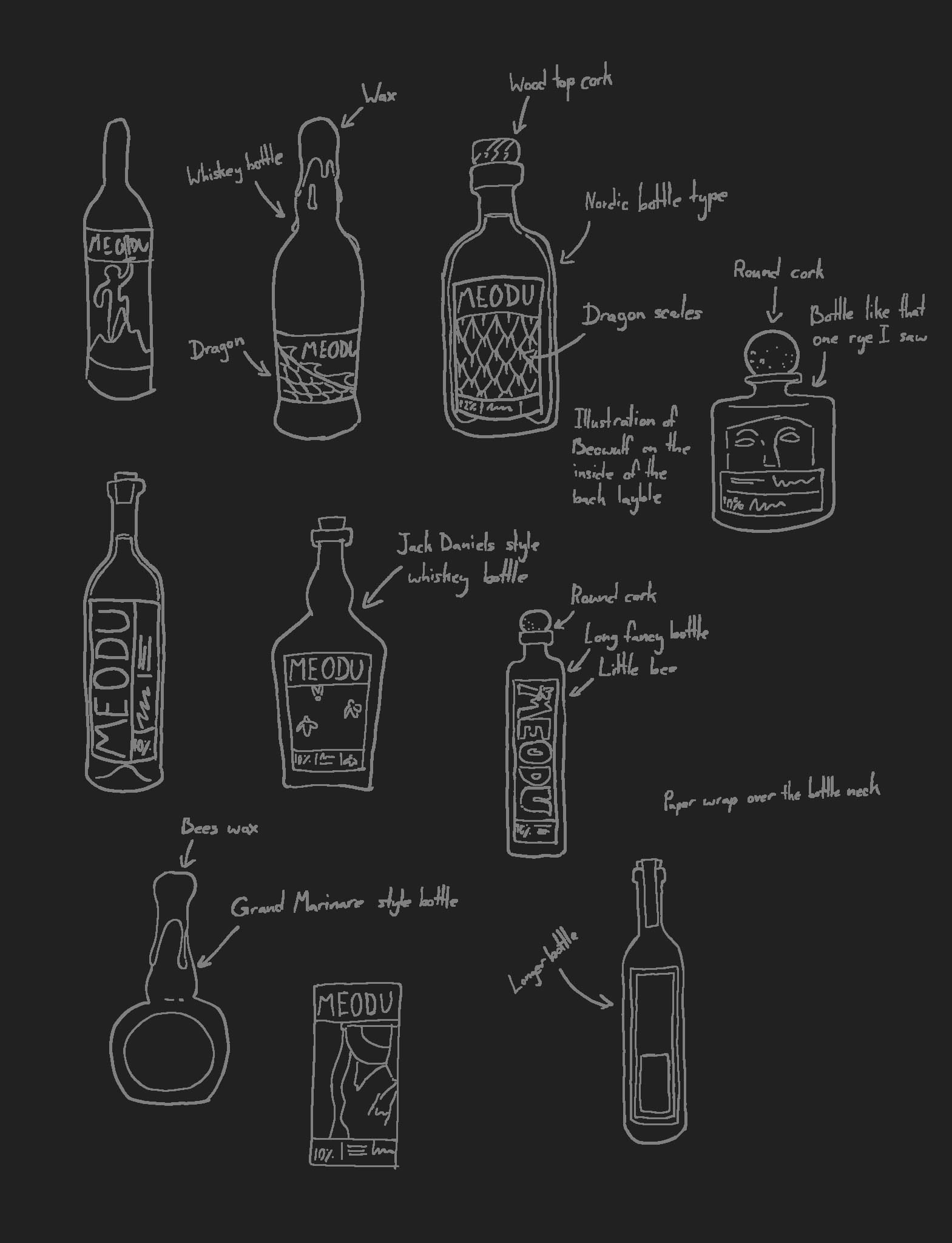 One tastes with their eyes before anything else, and so it was important during the design process that I paid particular attention to the bottle type. Throughout a series of sketches, I experimented with different bottle types, label shapes, quark types, and flourishes to conjure a visual presence that was consistent with the brand concept.