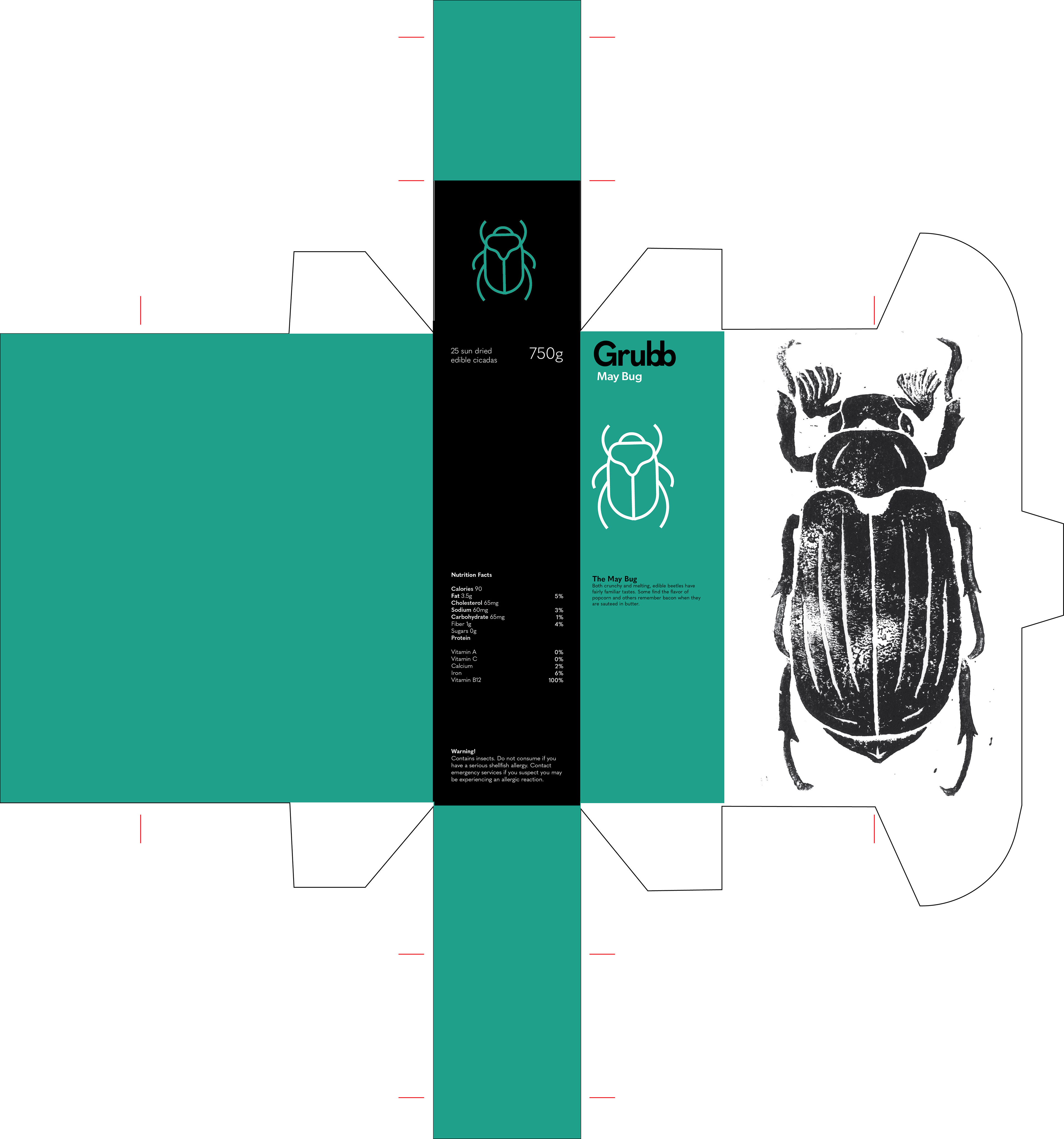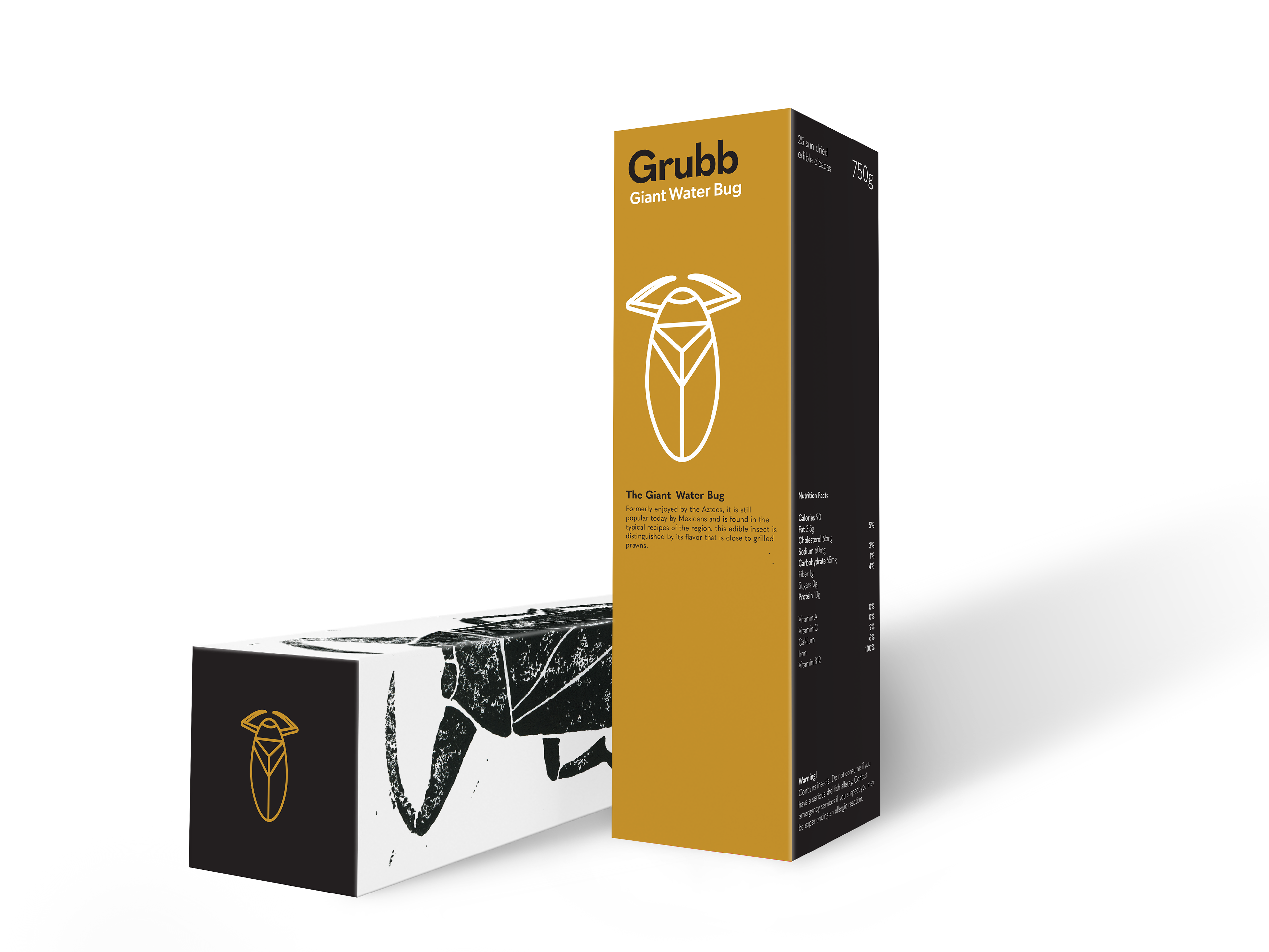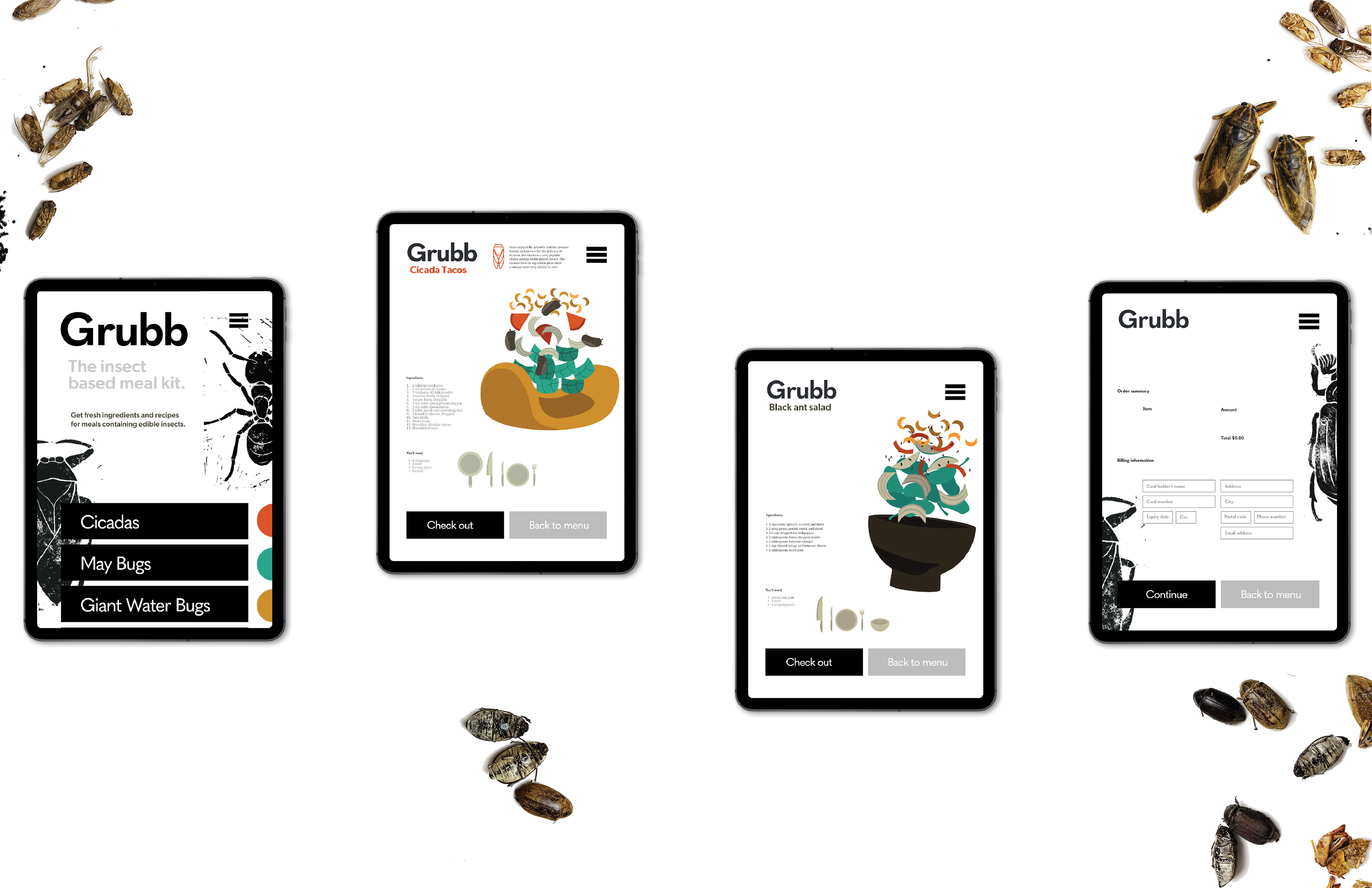 During my research, I discovered that the majority of harmful carbon waste produced is caused by livestock production, distribution, and consumption. The Food and Agriculture Organization of the United Nations suggested insect consumption as an ecologically viable alternative. However, there is the problem of convincing the public to try eating bugs. The Grubb brand addresses this environmental problem by introducing insect consumption as a healthy, eco-friendly alternative protein source into a population that otherwise may be opposed to insect consumption. The meal kit would provide ingredients and recipes for insect-based meals as a way of introducing insect consumption to the public.
