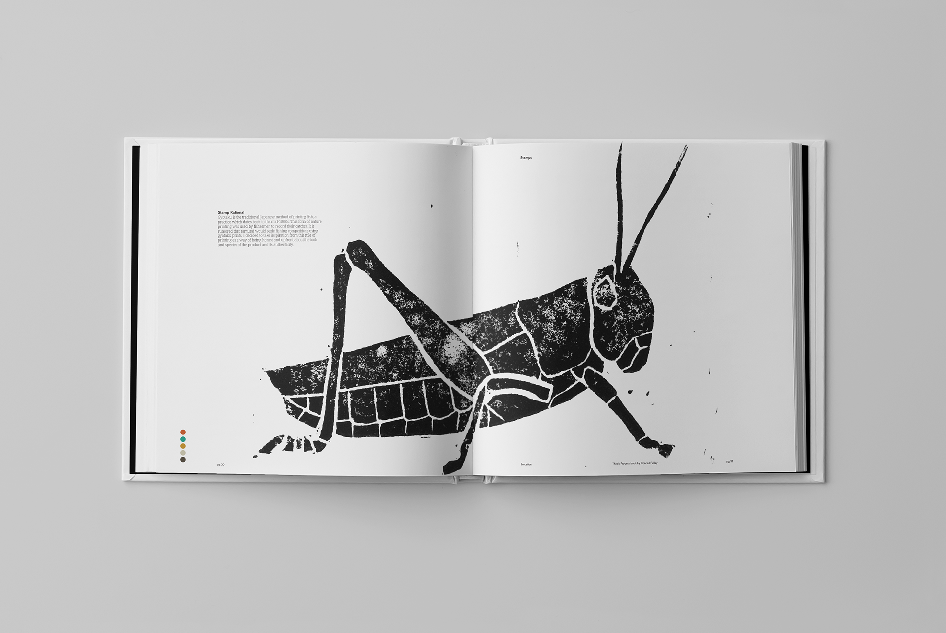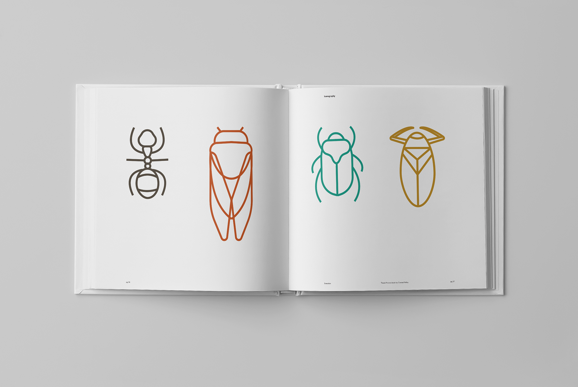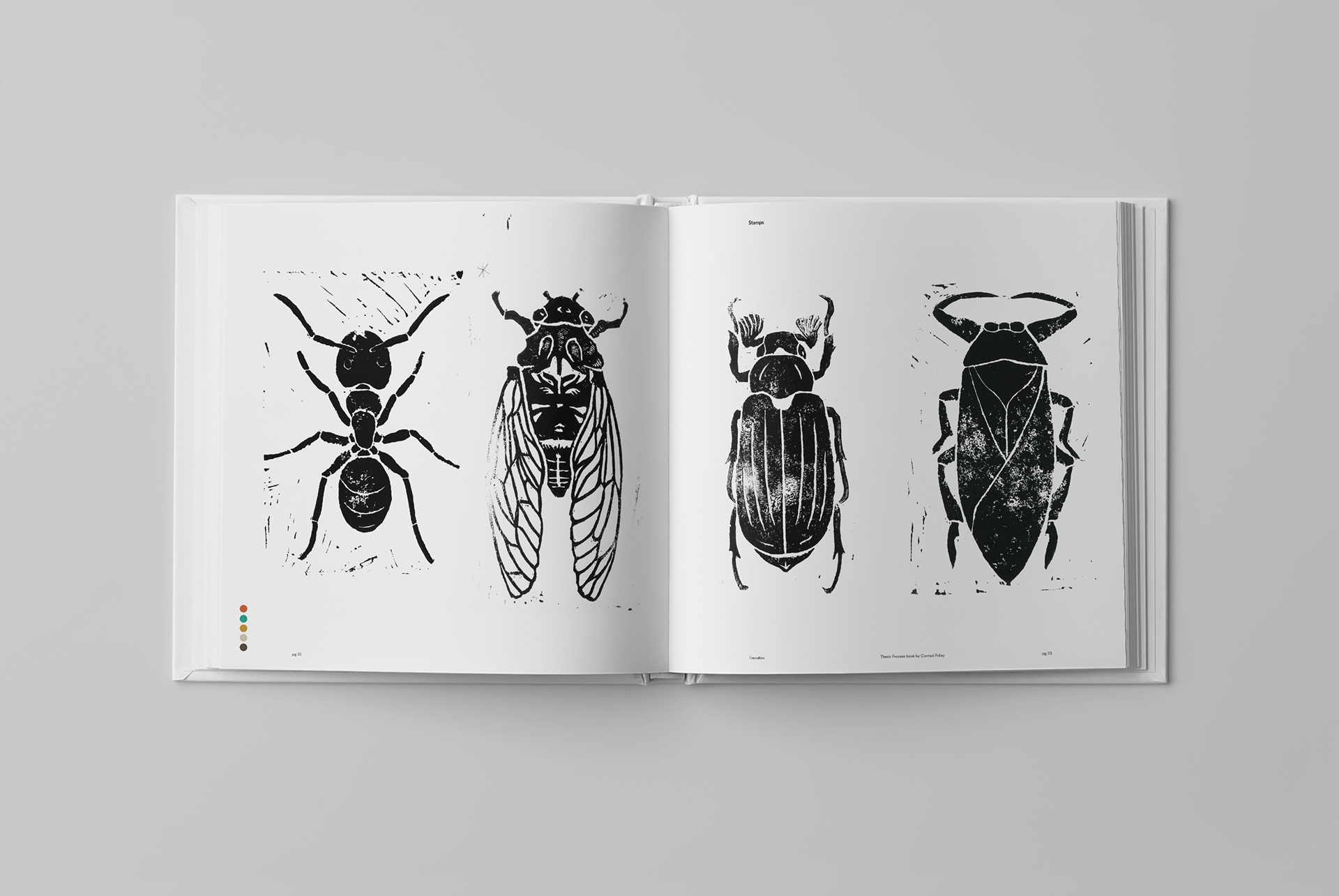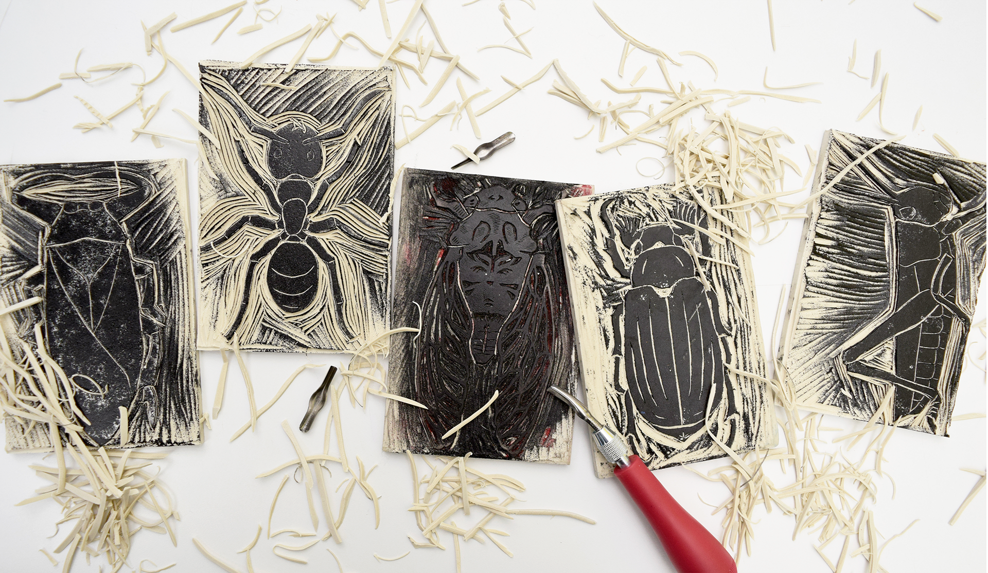 These linocut stamps serve as icons for each of the insect types that make up the primary protein of the meals provided by the meal kit. In this instance, the insects chosen for the project are black ants, cicadas, giant water beetles, grasshoppers, and may bugs.